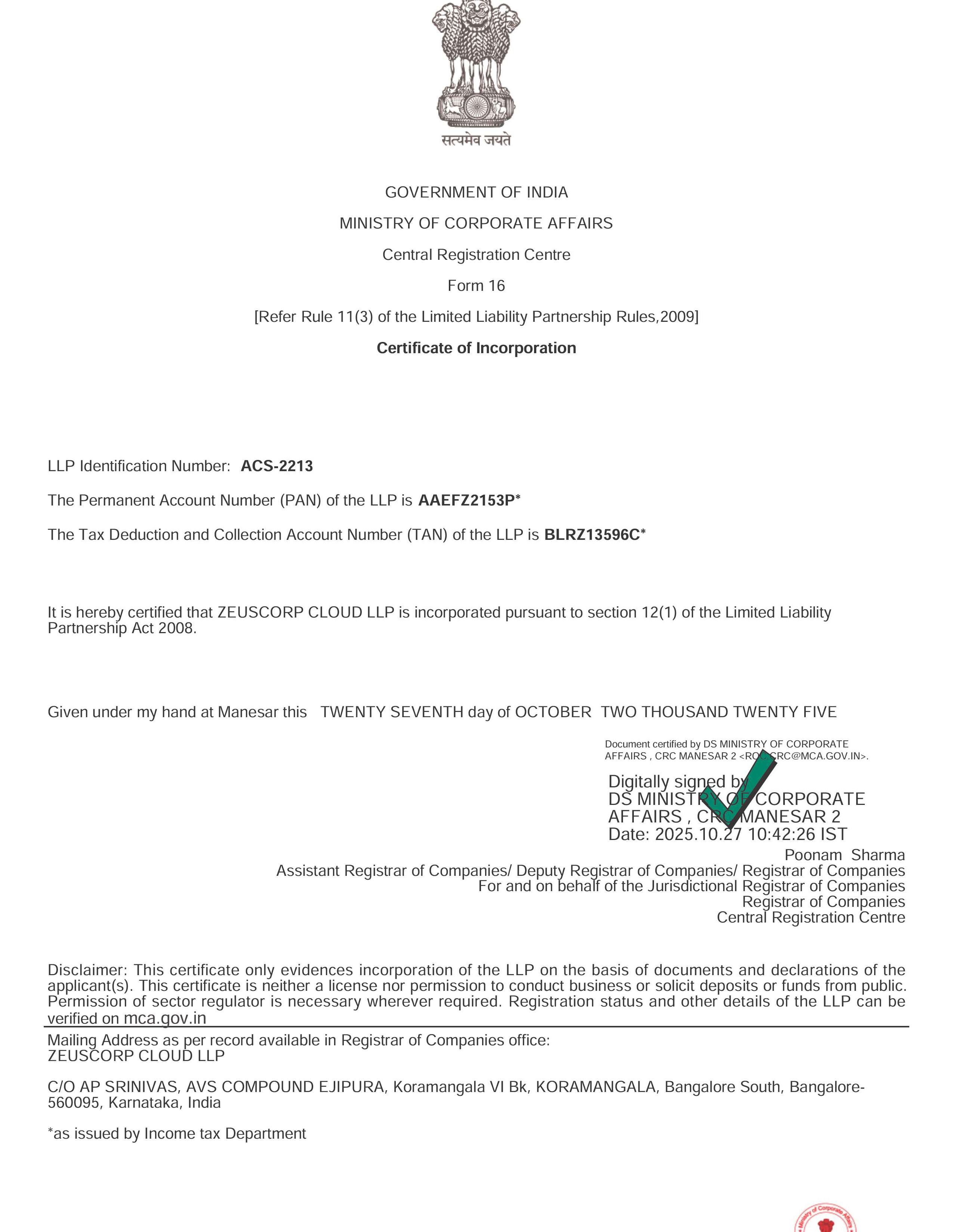 The Certificate of Incorporation issued by the Government of India officially recognizes Zeuscorp as a legally registered entity. It confirms our compliance with statutory requirements and establishes our credibility as a formally incorporated organization.